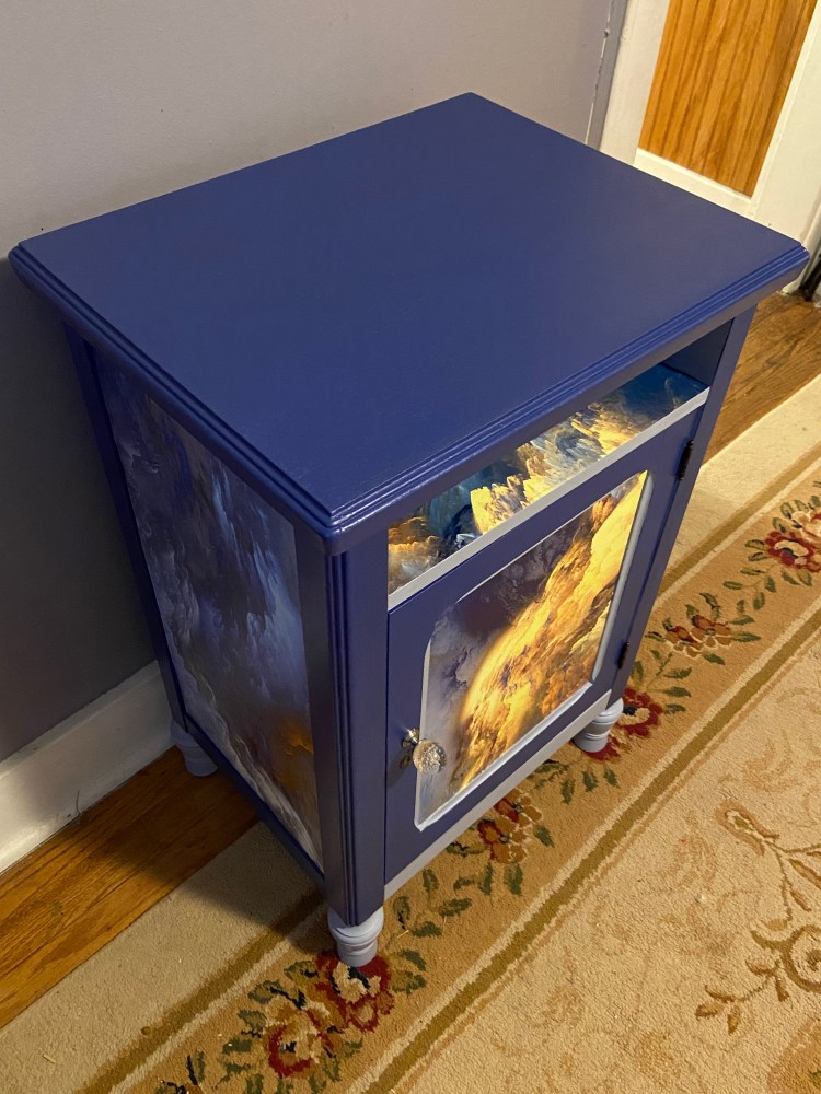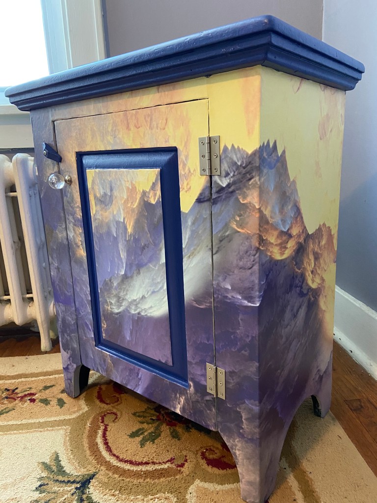 This client loves jelly cabinets, so we worked together to find the perfect piece that would be transformed and used in her home as an end table or nightstand. Inspired by her love of the Sweet Dream Swirls piece I’d previously done, the result is this beautiful cabinet. View a video of this project here.