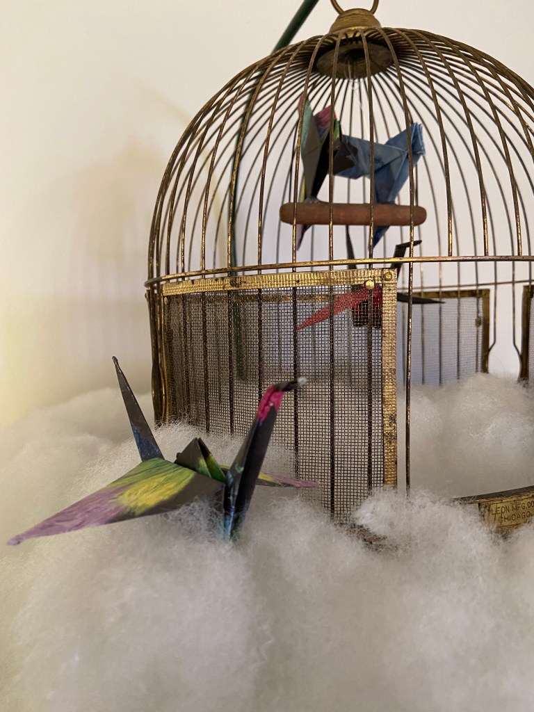 Available for your home. Would I put a bird on everything given the chance? Yes. But this time I put birds in it, too (what a change of pace, right?). Taking a bird cage purchased many years ago, it was transformed into a cloud light with origami birds. You can view more photos here.